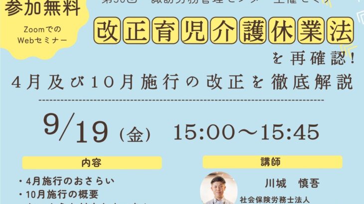 令和7年4月及び10月に施行される「改正育児介護休業法」は、企業にとって対応が必須となる重要な法改正です。本セミナーでは、改正内容の概要を徹底解説し、実務担当者が直面する課題を具体的に解説します。また […]