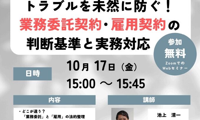 働き方の多様化が進む中、業務委託と雇用の線引きはますます複雑になっています。本セミナーでは、「業務委託」と「雇用」の違いを改めて法的に整理し、正しい判断のポイントをお伝えします。また、実際に「偽装請負 […]