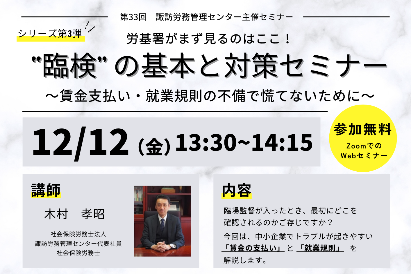 本セミナーでは、労基署が最初に確認するポイントから、実際の是正指導で多い指摘事項、そして事前に準備しておくべき実務対応まで、社労士が分かりやすく解説します。